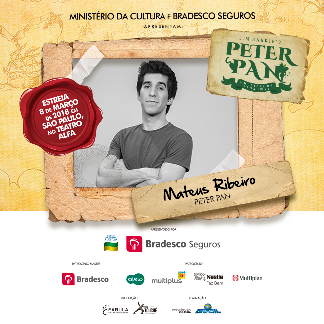 O elenco de “Peter Pan – O Musical da Broadway”, composto por 29 atores, que cantam e dançam, é encabeçado por Mateus Ribeiro no papel do menino que não queria crescer, ao lado de Daniel Boaventura – que se divide entre a função de Capitão Gancho e de coprodutor do espetáculo.