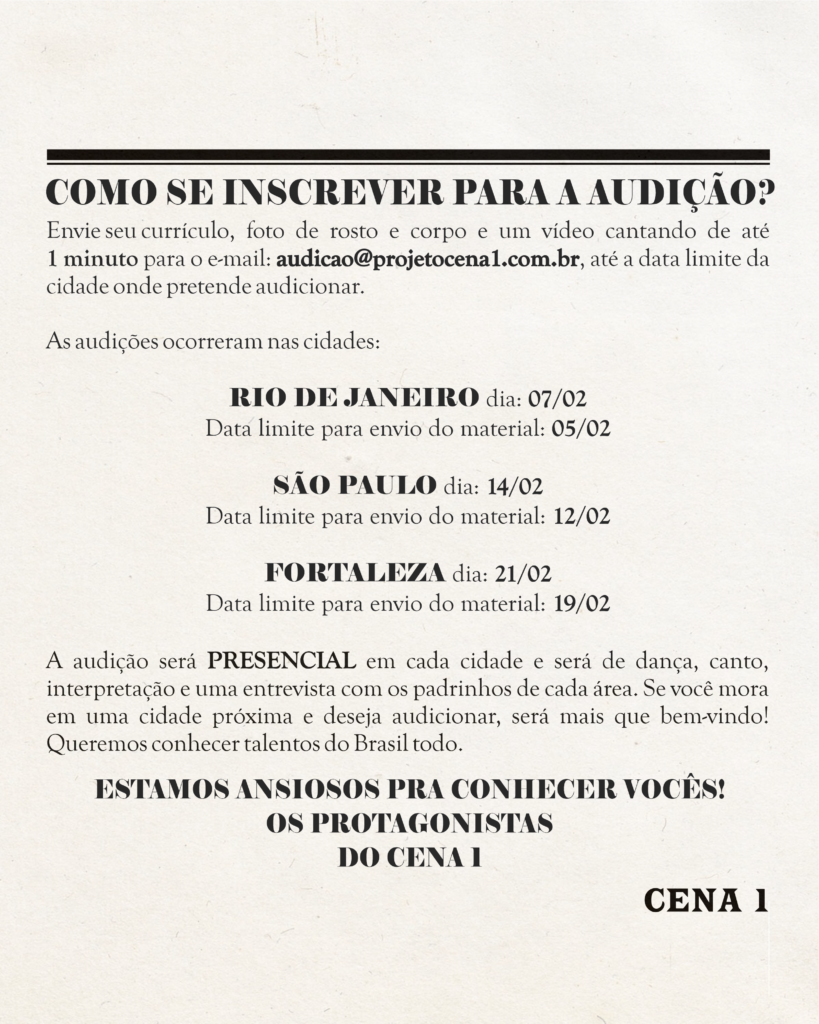 Estão aptos a participar estudantes de teatro musical sem prévia experiência em musical profissional de grande porte. A produção do projeto CENA 1 não oferece traslado nem hospedagem, apenas a bolsa de estudos. Os interessados devem enviar curriculum, foto de rosto e corpo e vídeo de 1 minuto cantando para o e-mail audicao@projetocena1.com.br.