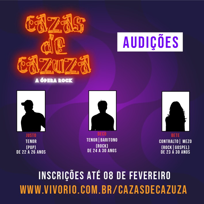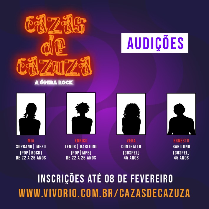 Diversidade de talentos será o foco da escolha do novo elenco, que contará com um workshop organizado pela ‘Vivo Rio Academy’. Para as audições, os interessados devem ter vozes que representem estilos como Pop, Rock, Gospel e MPB. Serão ao todo 18 selecionados, entre elenco e coro, que devem ter idade entre 18 e 45 anos. Para os testes de personagem é preciso atender as necessidades dos perfis descritos nos anúncios oficiais abaixo: