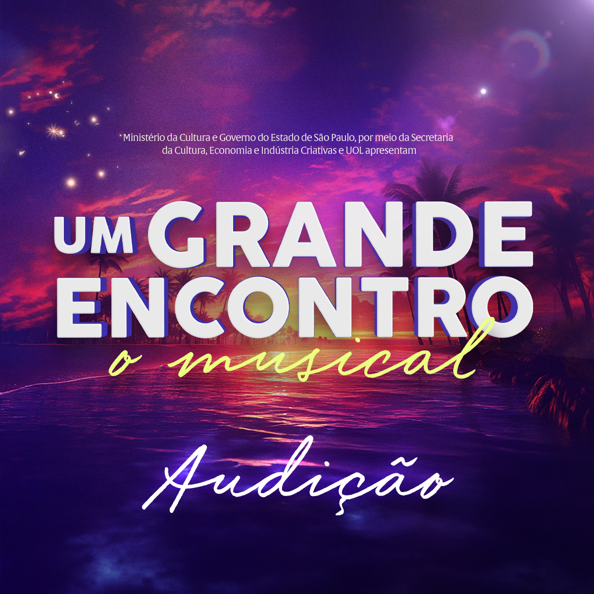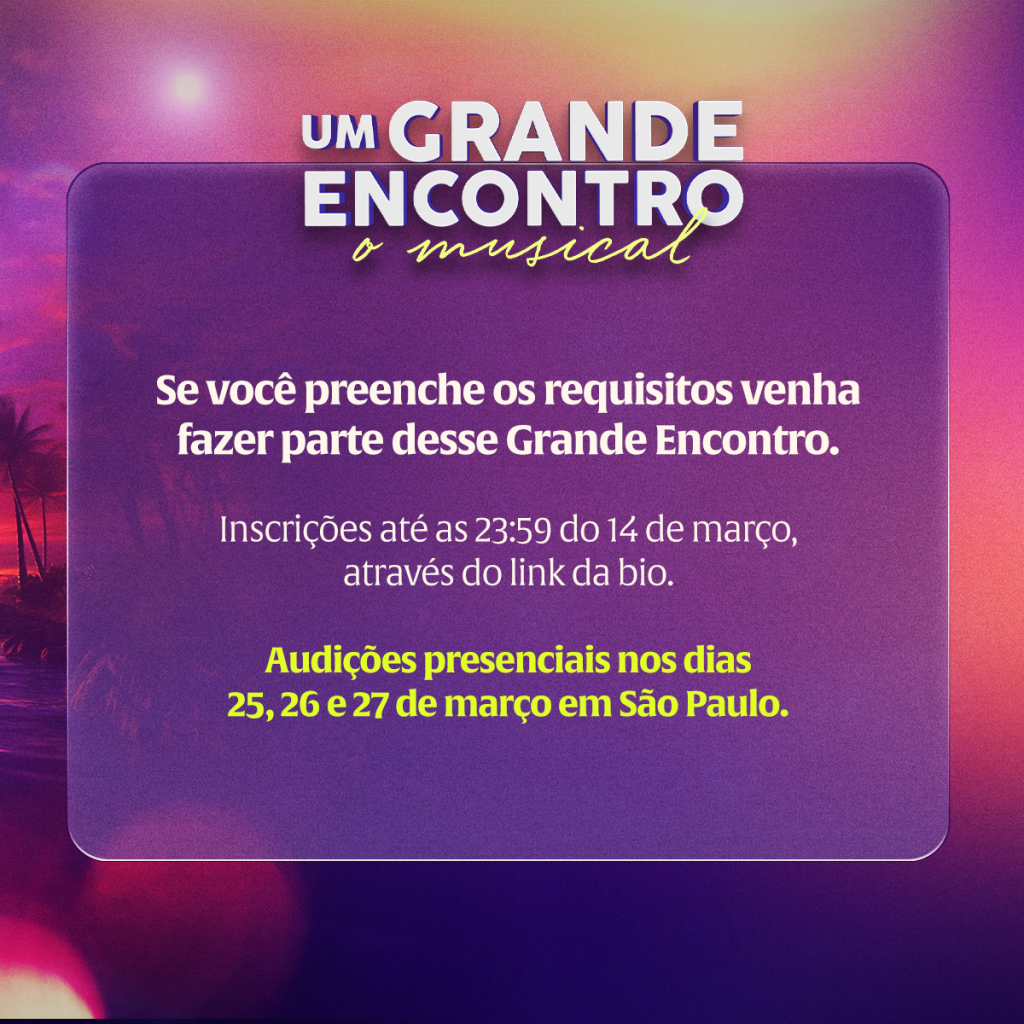 Estão abertas as audições para o espetáculo “Um Grande Encontro – O Musical”, inspirado na trilogia de álbuns homônima, estrelada por Elba Ramalho, Alceu Valença e Geraldo Azevedo e que se tornou um marco da música popular brasileira.