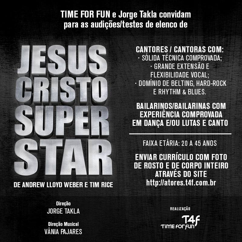 A nova produção da Time For Fun, “Jesus Cristo Superstar” marca um novo momento da companhia, que a partir de outubro passa a administrar o Complexo Cultural Ohtake, antigo Teatro Geo. O musical, que estreia na casa nova, chega ao Brasil em março de 2014, sob a direção de Jorge Takla e direção musical de Vânia Pajares.