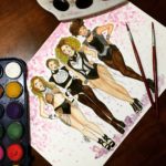 A partir do momento que escolho a pessoa a ser ilustrada e a foto usada como referência, eu traço algumas linhas de apoio bem finas e leves no papel. Elas só servem pra eu ter uma visão geral de onde cada coisa deve ficar (olhos, nariz, boca, mãos…) e para melhor aproveitamento e distribuição do tema no papel. Após esses primeiros traços, inicia-se um processo de mais detalhamento, onde as formas começam a ganhar mais definição. Nesse momento, a ilustração já fica bem próxima do que é apresentado no fim, uma vez que o estágio seguinte já é o contorno final com a caneta nanquim de ponta média/fina (dependendo da necessidade). Uma vez que o contorno definitivo é feito, são utilizados alguns pincéis (dependendo do desenho e do nível de detalhamento, mais finos ou mais grossos), godê com água, uma folha pra testar as cores e a quantidade de água a ser utilizada, que sempre está ao lado do desenho a ser colorido e, por fim, a aquarela seca. Na maioria dos desenhos, a aquarela utilizada é escolar. Além de ter um custo bem acessível, deixa um resultado que eu gosto bastante. As tonalidades ficam bem suaves e é bem simples manuseá-la. Entretanto, quando preciso de cores mais vivas e fortes, utilizo outras marcas, mas é menos frequente”.