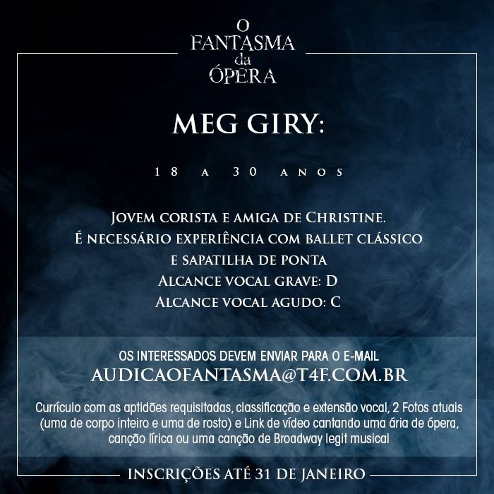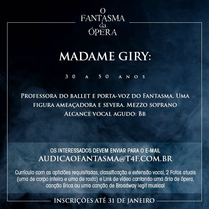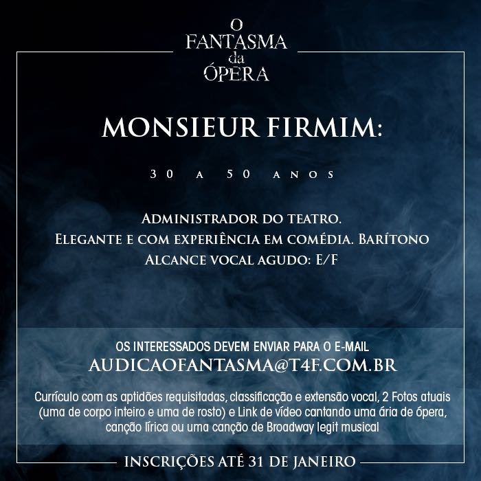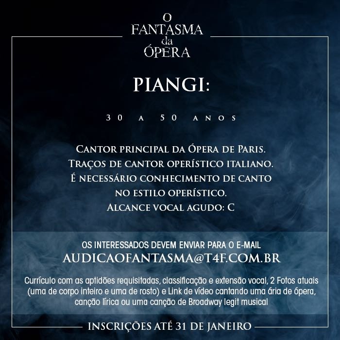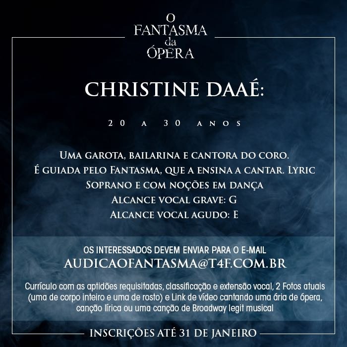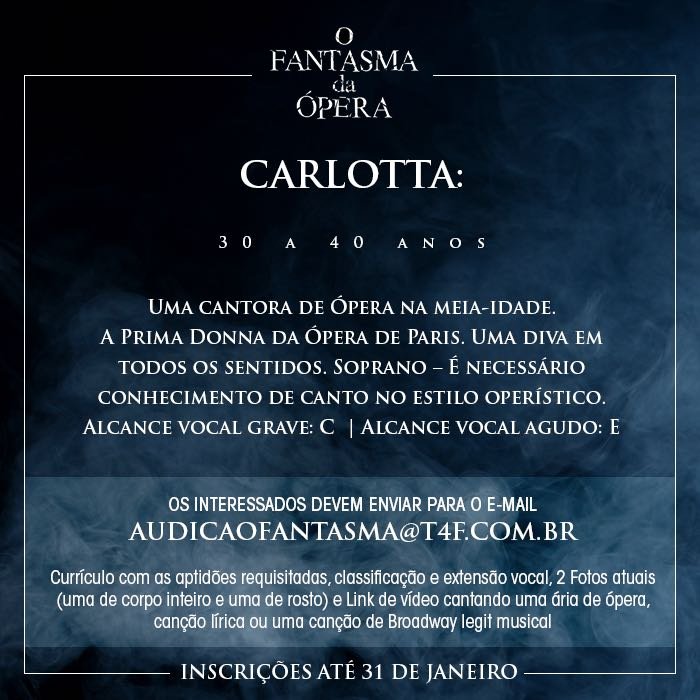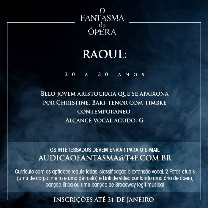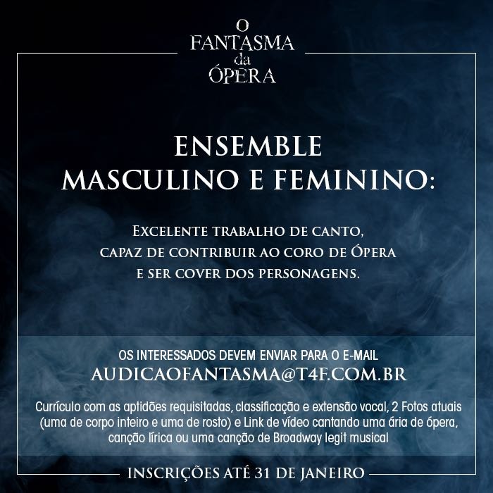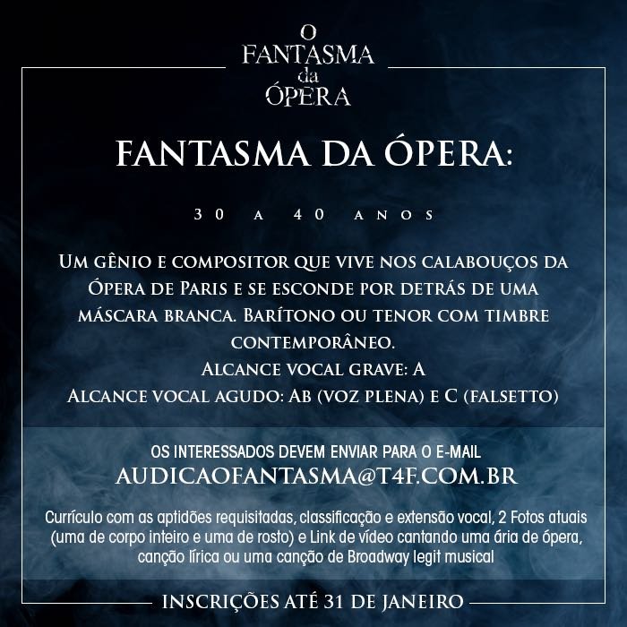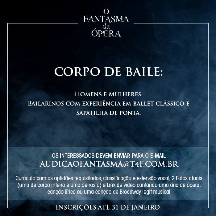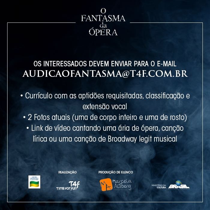 É oficial! Após 13 anos da estreia no Brasil, um dos clássicos mais conhecidos do teatro musical inglês e norte-americano vai retornar ao país. A T4F prepara ainda para 2018 uma nova montagem de “O Fantasma da Ópera”, de Andrew Lloyd Webber, para ocupar o Teatro Renault, mesmo local que recebeu a produção em 2005, quando a casa de espetáculos ainda era chamada de Teatro Abril.
